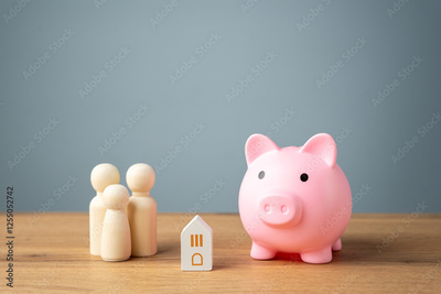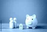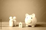 Piggy bank, family figures and a small house. The concept of family budget, mortgage lending and money in the family. Real estate and housing