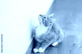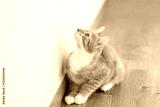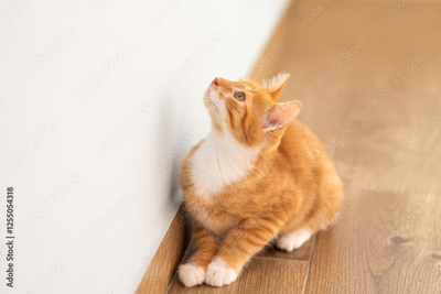 Ginger tabby little kitten look away sitting on the floor. Animal portrait. Pet. Sitting posing. Beautiful funny kitten. Selective focus