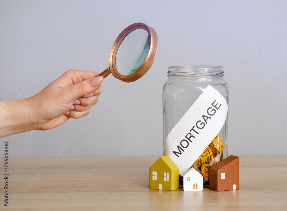 Bank of coins Mortgage. The accumulation of money to pay interest rates on mortgages. Buying a property in debt. Take credit for housing. Mortgage tax and loan concept.