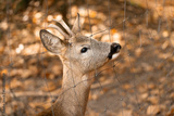 A beautiful young deer walks in the autumn forest on a sunny day. portrait