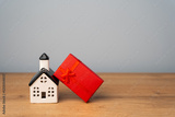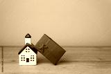 Miniature house and gift box. Housing as a gift. Win an apartment in the lottery. To inherit property. Holiday discounts. Buying an apartment at a low price. Sale of real estate. Present