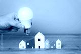 Hand holding light bulb to residential buildings. Concept of power supply. Innovations and technologies of smart home. Autonomous energy and housing. Energy saving.
