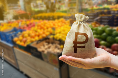 Russian rubles money bag on the background of a grocery store counter with fresh organic vegetables and fruits. Concept of cost of goods and food products. Grocery set. Import and export