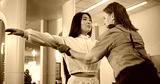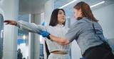 Security Checkpoint in Airport Terminal: Asian Woman Walking Through Metal Detector Scanner Gates. Female Security Officer Inspects Passenger for Plane Flight. Queue of Tourists Waiting for Scanning.
