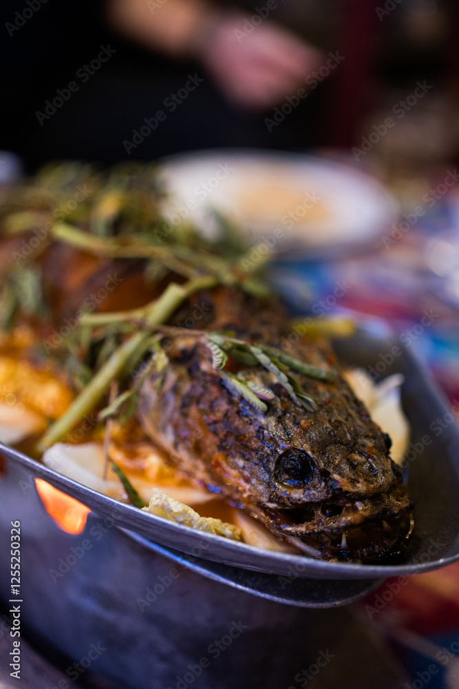 Steamed tamarind flavored giant snakehead fish soup with water mimosa or sour soup. Thai food. Sour soup with fish and mixed veggies. Gaeng Som Pla Chon