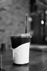 Iced of Americano in plastic takeaway plastic glass with white tissue placed on wood table interior coffee shop.