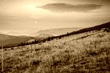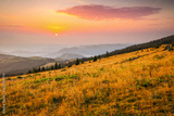 The round disk of the sun rises above the horizon of distant mountain ranges. Carpathians, Ukraine, Europe.