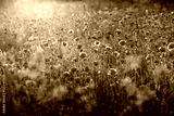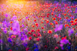 A charming picture of red poppies on a spring meadow against the sun.