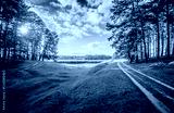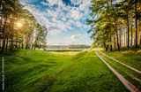 Charming view of a green forest with pine trees and shining grass in sunny weather.
