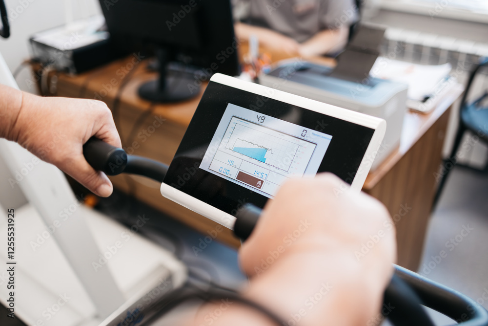 An elderly man trains on a simulator in a rehabilitation center under the supervision of a medical worker. The concept is health promotion through individual training programs.