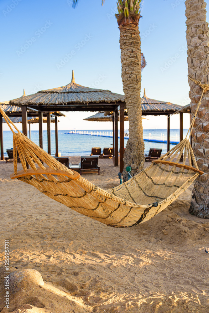 Relaxing in a hammock on the beach by palm trees under a clear blue sky in a tropical paradise