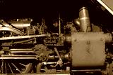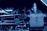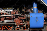 Steam locomotive wheels and rods closeup. Detail of mechanical parts, wheels and equipment of the train.