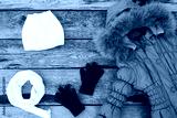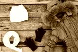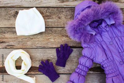 Children's winter clothes: warm jacket, hat, scarf, gloves on old wooden background. Top view.