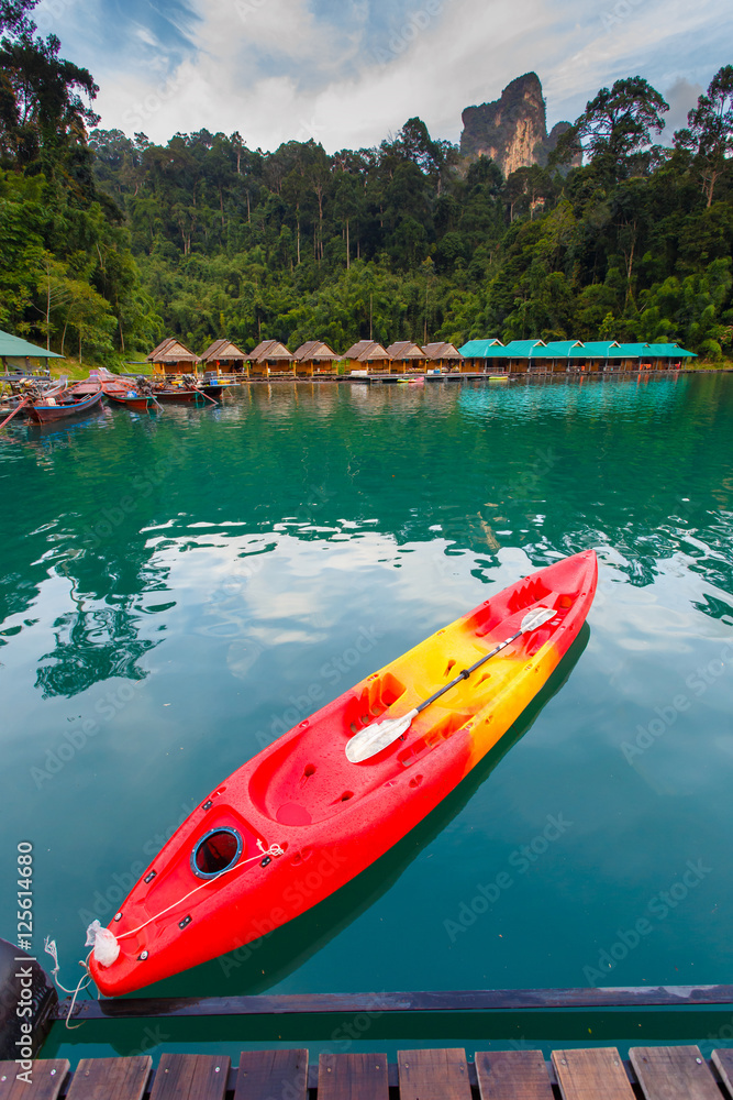 Canoe in a beautiful mountains lake forest and river natural attractions in Ratchaprapha Dam at Khao Sok National Park, Surat Thani Province, Thailand.