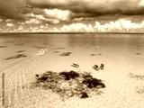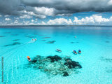 Aerial view of colorful boats and yachts in clear water on sunny summer day. Mnemba island, Zanzibar. Top view of sandbank in low tide, blue sea, swimming people, yachts, dramatic sky with clouds