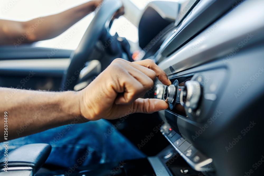 Close up of black car driver's hand changing radio station in a vehicle.