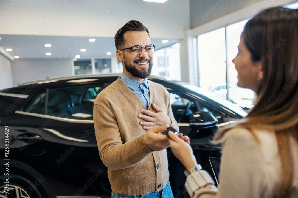 Smiling car buyer getting new car keys from a saleswoman at classy car salon.