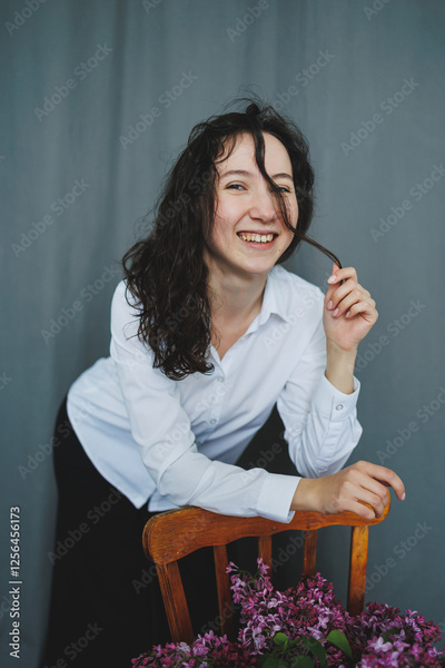 A Cheerful Woman with Beautiful Curly Hair Enjoying Playing with Vibrant Flowers