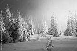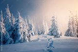 Snow-covered fir trees in a glowing fog at sunset. Idyllic seasonal pattern. Photo wallpaper.