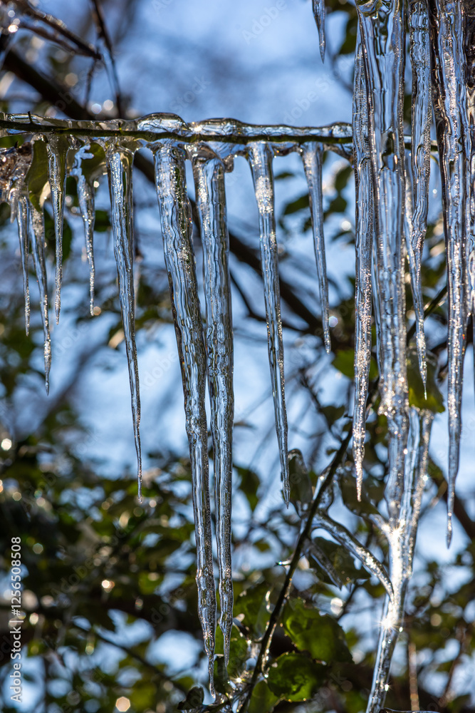 Tree branches with green leaves covered in ice in winter.