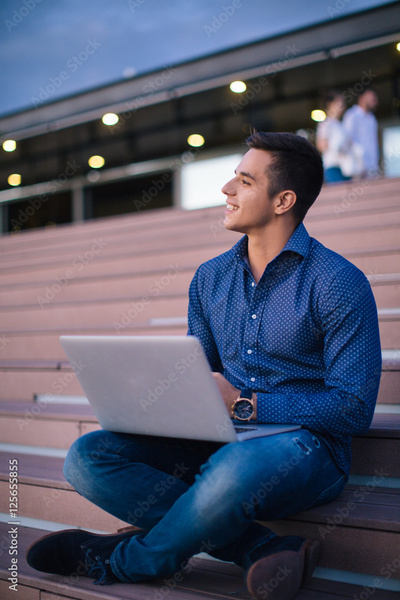 Young man sitting at the stairs, using laptop and talking on mobile phone