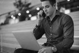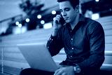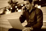 Young man sitting at the stairs, using laptop and talking on mobile phone