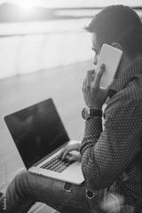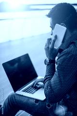 Young man sitting at the stairs, using laptop and talking on mobile phone. Back view