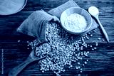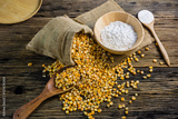 Corn flour and dried corn on a wooden table old.