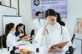 A diverse team of doctors and nurses work together in a hospital office and talk to each other. Teamwork and dedication to providing quality healthcare and medical solutions.