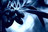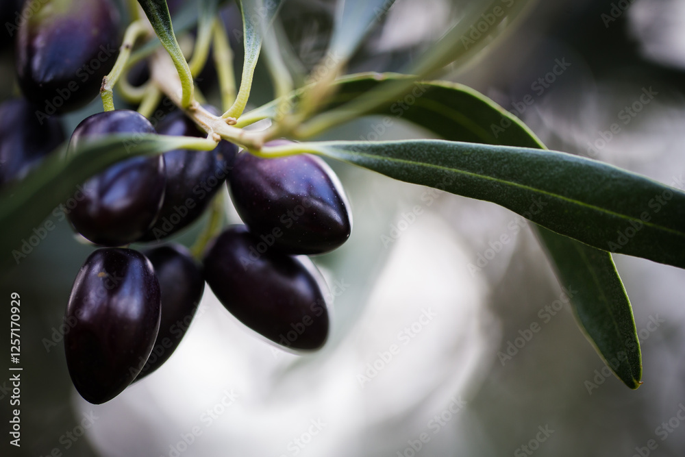 Close-up of ripe and unripe olives on a branch, surrounded by silver-green olive leaves, with a blurred natural background, depicting a Mediterranean agricultural setting.