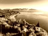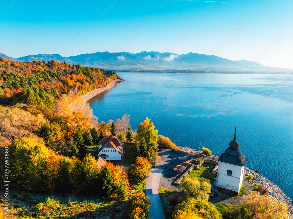Liptov region with Tatras mountains around. Liptovska mara dam landspace. Autumn deciduous forest view from above