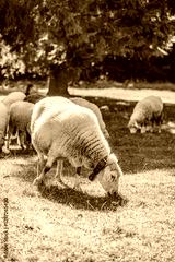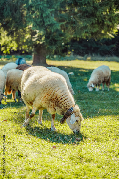 Sheep walks freely on a farm on a sunny day. Eco farm