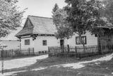 Rare wooden bell tower with folk houses located in open-air museum of Liptov Village, Slovakia - Pribylina
