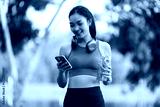 Smiling young woman in athletic wear using a smartphone and holding a water bottle. Headphones around her neck, enjoying a break during an outdoor workout in a park setting
