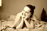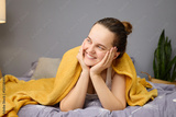 A young woman lies on her stomach on a bed, smiling warmly while resting her head on her hands. She is wrapped in a soft yellow blanket, surrounded by a peaceful indoor environment