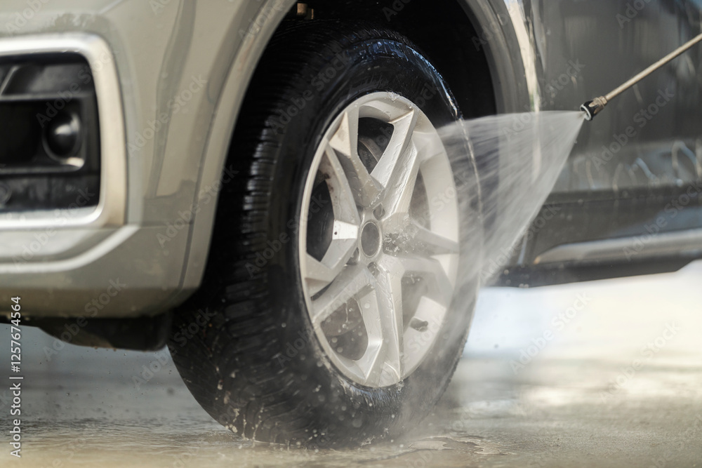 Close up of a nozzle cleaning car tire under water pressure at car wash.