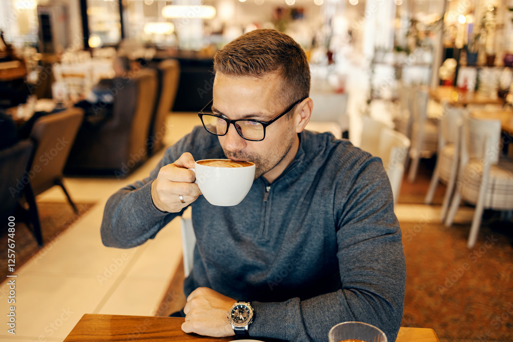 Portrait of a man with eyeglasses drinking fresh morning coffee in coffee shop.