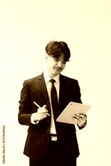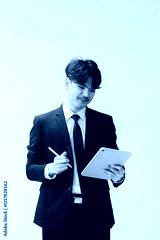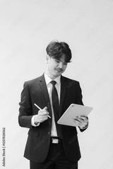 Young Asian businessman working with tablet in hand isolated on white background,portrait of young businessman in suit ,tie using tablet standing posing white background