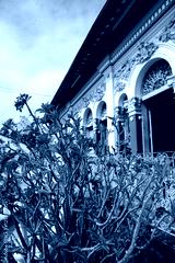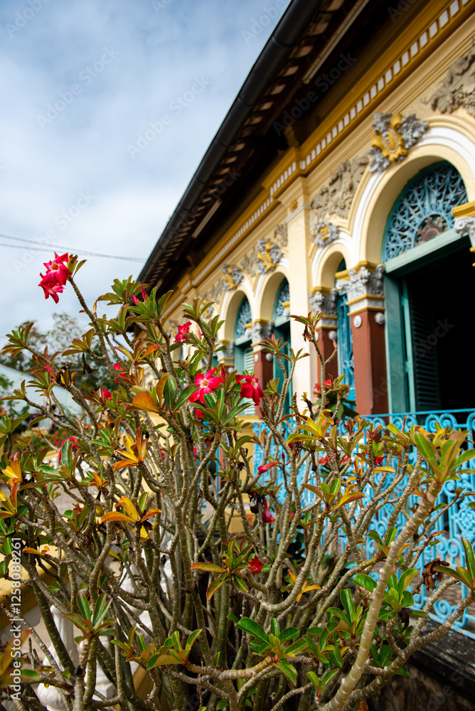 Close-up blossom red plumeria or frangipani flower perennial shrubs at entrance to Southern Vietnamese ancient house with 5 compartments architectural in Can Tho, Vietnam, heritage travel