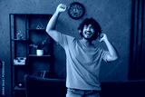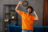 Young Indian man wears casual clothes sits on blue sofa couch listen music in headphones raise up hands dance stay at home hotel flat rest spend free spare time in living room indoor. Lounge concept.