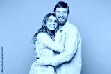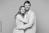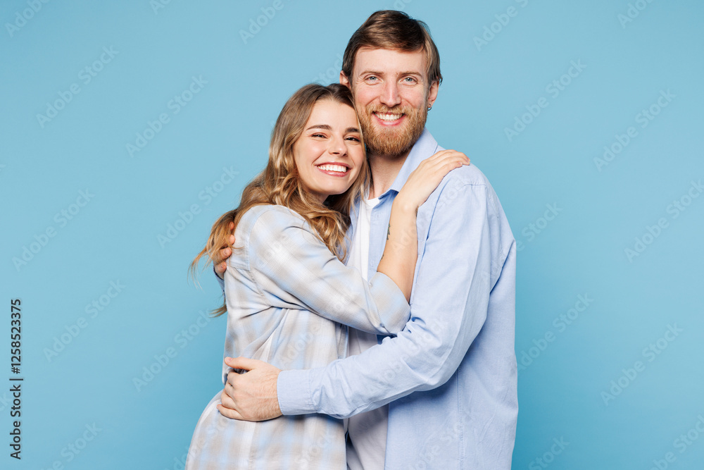 Side profile view young couple two friends family man woman wearing shirt casual clothes cuddle embrace together isolated on pastel plain light blue cyan background studio portrait. Lifestyle concept.