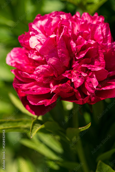 Vibrant Pink Peony Blooming Among Lush Green Foliage on a Bright Sunny Day in Early Summer.