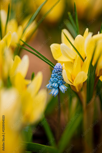 Vibrant Blooms Contrast in a Garden, Showcasing Blue and Yellow Flowers During a Sunny Spring Afternoon, Inviting Nature's Beauty to Unfold in Full Splendor.