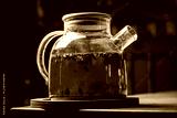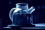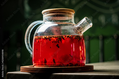 Vivid Herbal Infusion in a Glass Teapot Displayed on a Wooden Coaster, Showcasing the Beauty of Brewing Tea Indoors During a Cozy Afternoon.