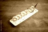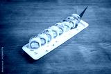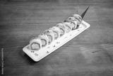 Savoring Creative Sushi Rolls Artfully Arranged on a Minimalist White Platter, Showcasing Layers of Fresh Ingredients and Delicate Garnishes.