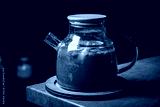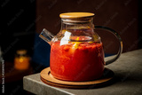 Boiling Bliss of Vibrant Herbal Tea in a Glass Pot Resting on a Wooden Tray With a Heartwarming Amber Glow, Inviting Warmth and Relaxation in a Cozy Setting.