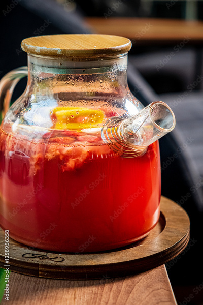 Refreshing Fruit Infusion in a Glass Pitcher Captures the Vibrant Essence of Summer Gatherings at a Cozy Outdoor Cafe.