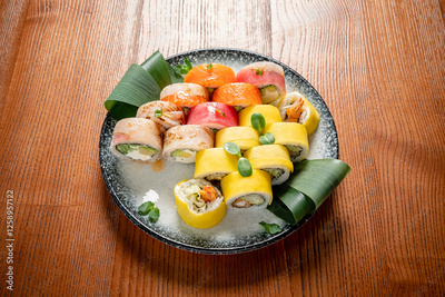 Colorful Sushi Platter Showcasing a Variety of Rolls Artfully Arranged on a Wooden Table, Enticing Flavors and Textures Delight the Senses During a Gourmet Dining Experience.