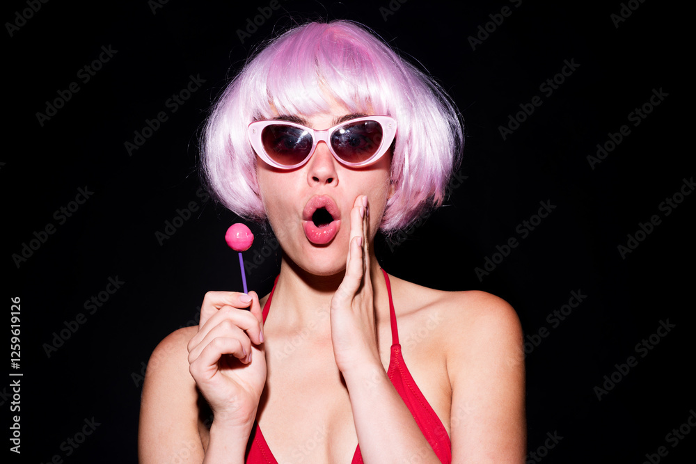 Lollypop in sensual woman lips. Sensual girl enjoys sweets. Sexy model licks a candy treat. Beautiful Sensual woman with a lollipop. Sensual lips and playful licking. Sexy model sucking a lollypop.