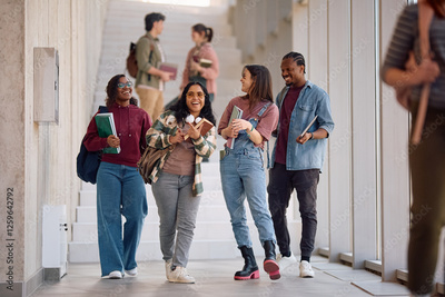 Happy university friends having fun after lecture.